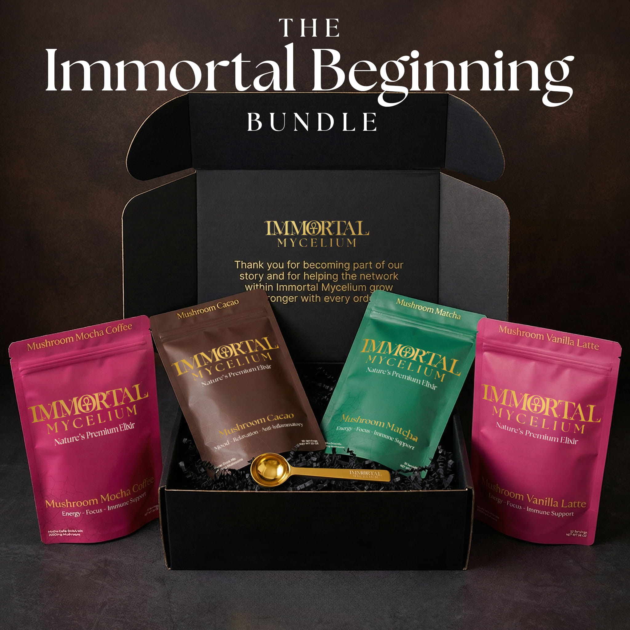 Begin your Immortal Mycelium journey with Vanilla Latte for smooth, comforting energy, Mocha Coffee for focused lift, Matcha for calm alertness, and Cacao for deep relaxation, complete with our gold ritual spoon.